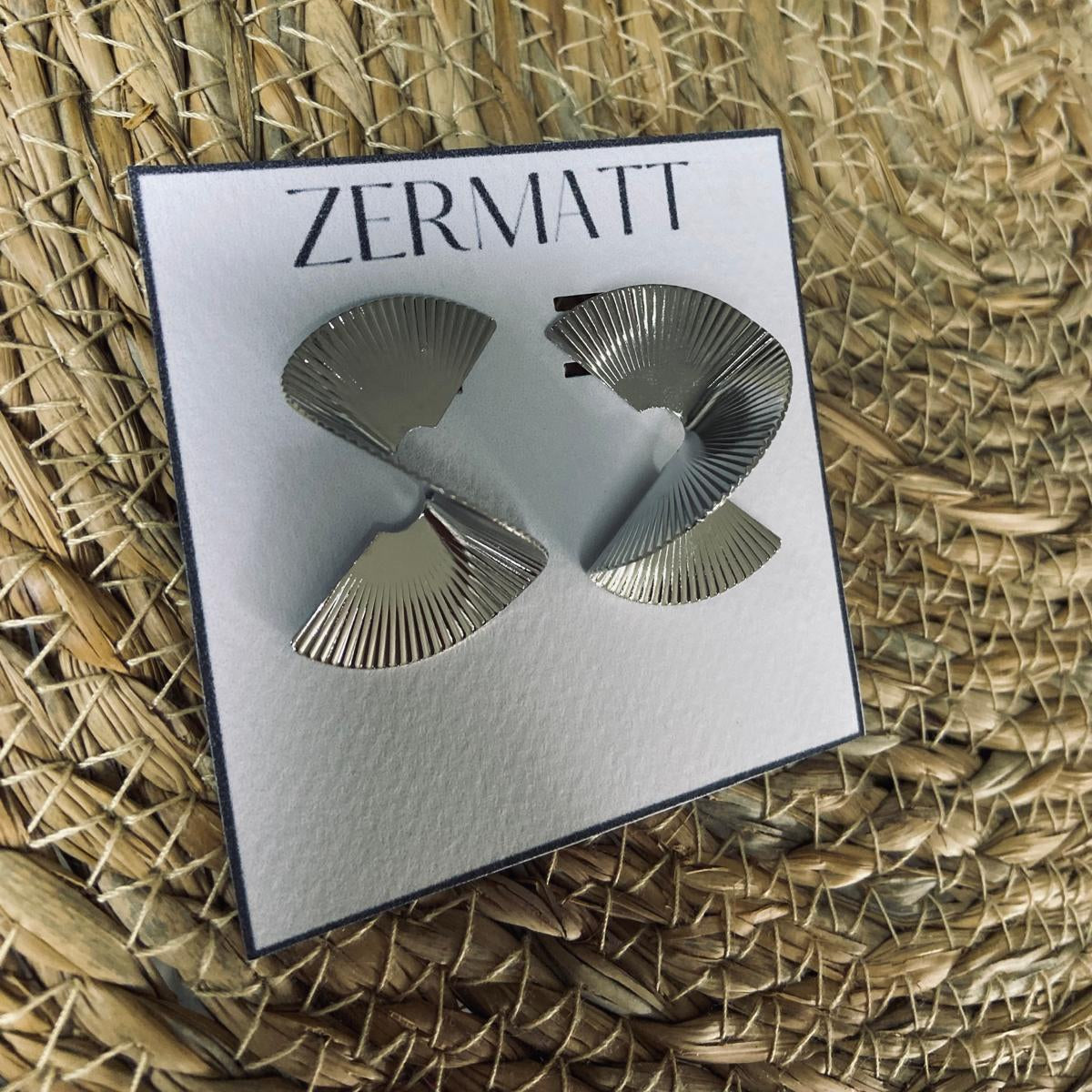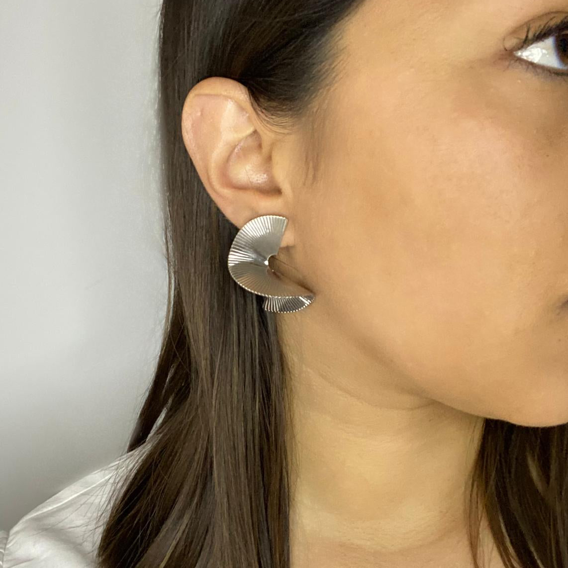 Aros plateados con relieve plisado tipo abanico lunar. Brillo sutil, línea escultórica y caída que estiliza el rostro.