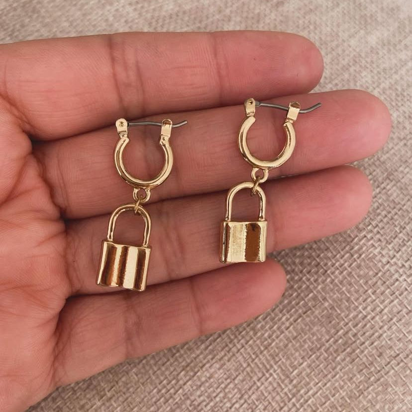 Caravanas doradas con charm candado pulido, modernas, livianas.
