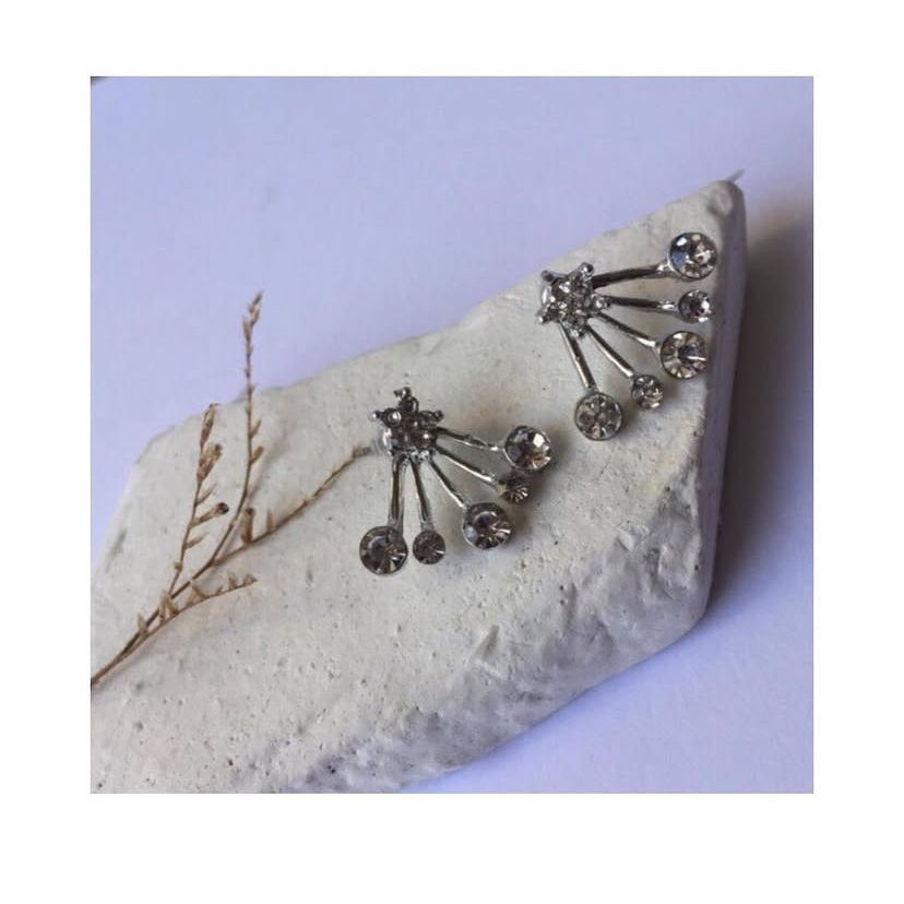 Plateados con rayos de strass en caída sutil. Brillo delicado que ilumina el rostro.