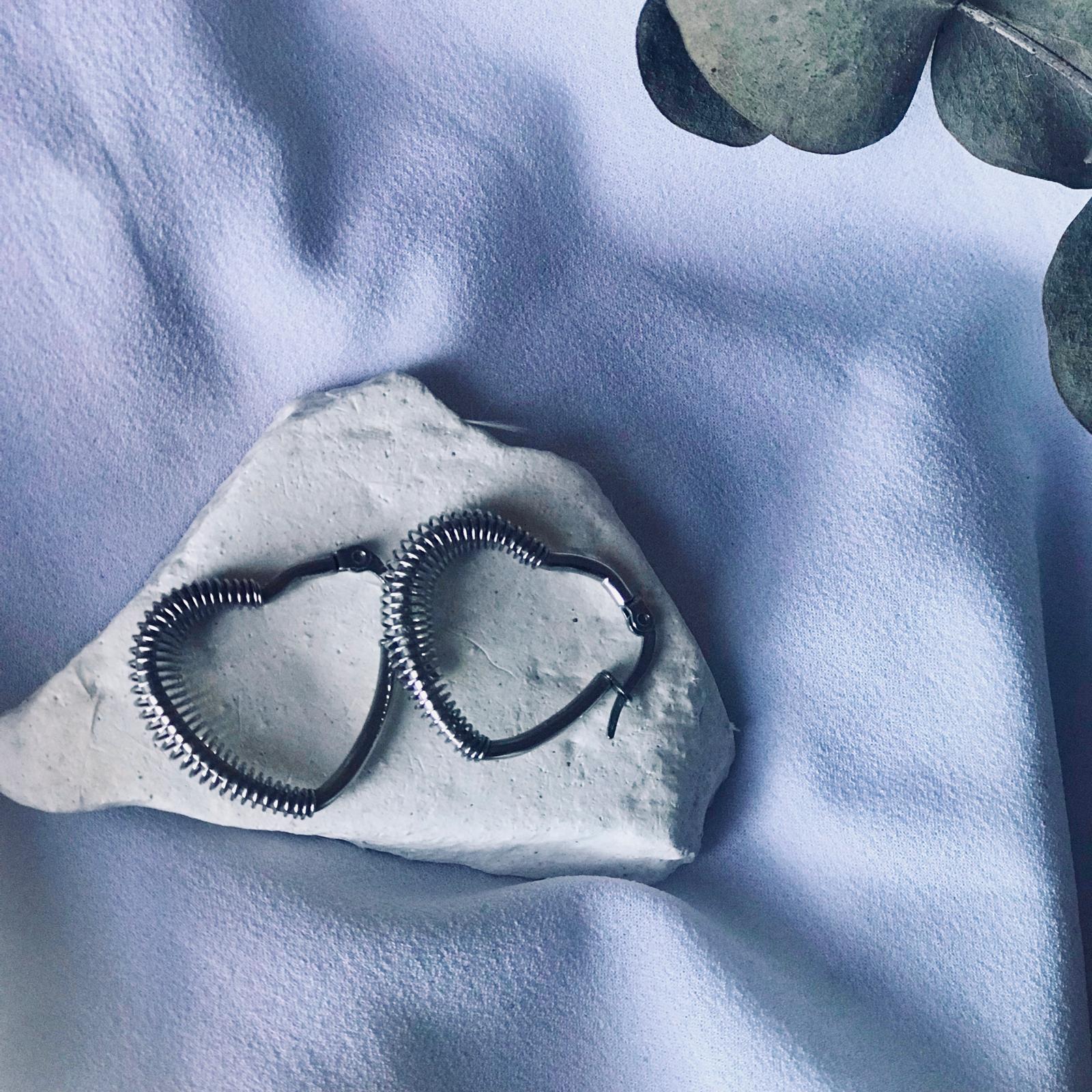 Caravanas en forma de corazón con detalle tipo resorte que aporta textura y luz.