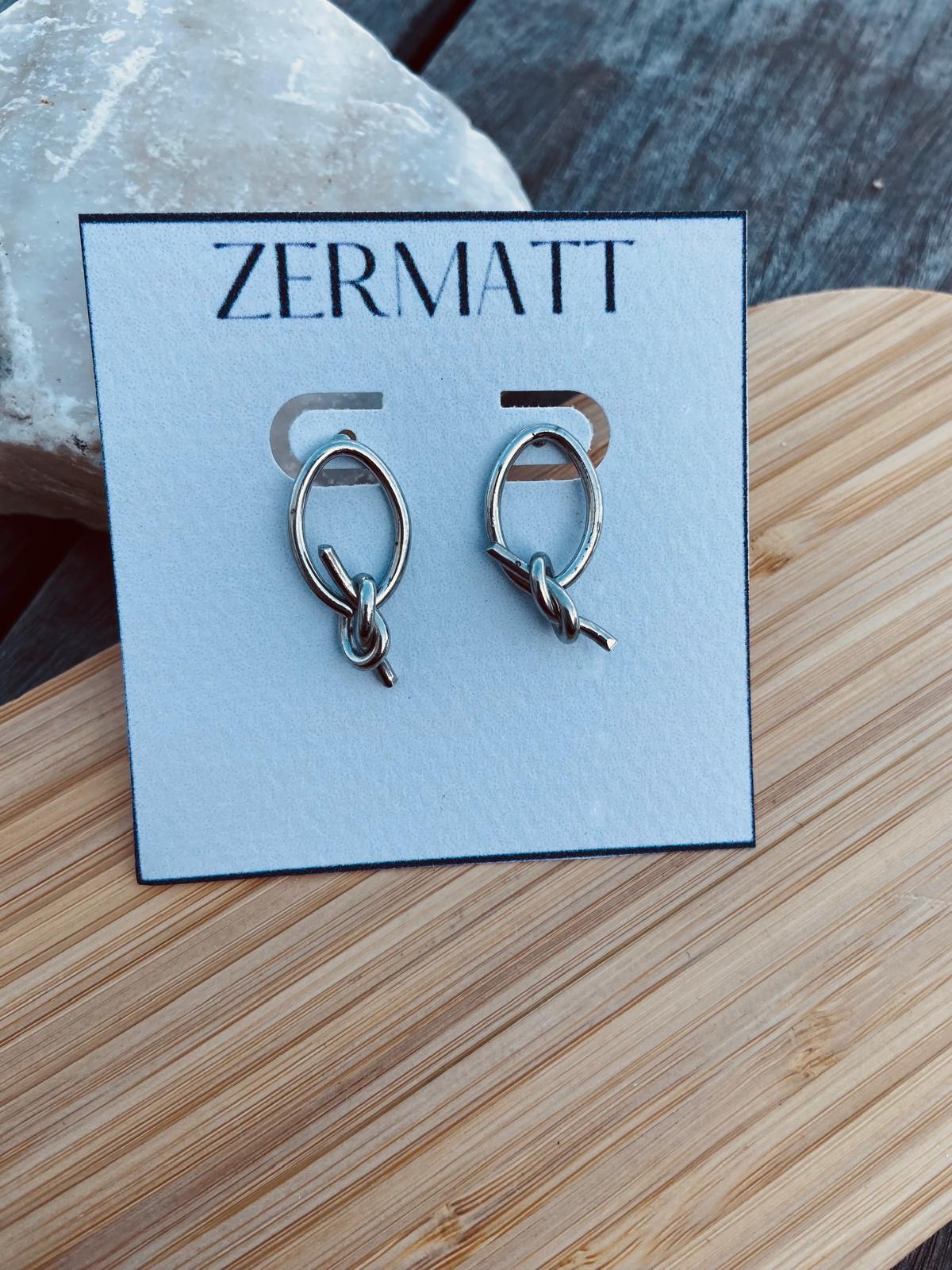 Un par delicado y moderno, mini caravanas ovaladas en tono plata con un nudo frontal que aporta carácter sin perder elegancia.