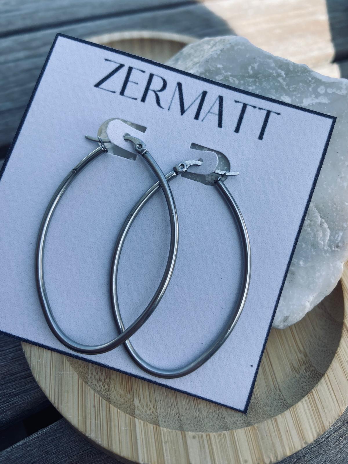 Caravanas ovaladas en tono plata, finas y livianas, pensadas para estilizar el rostro con un brillo sutil.